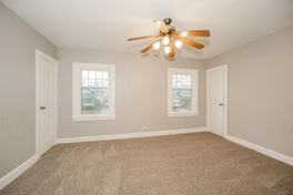 Upstairs, both bedrooms feature fresh carpeting, generous proportions, and multiple windows. The full bathroom includes a tub-shower combination with tile accents, built-in linen storage, and updated fixtures. Outside, the rear yard and driveway extend the usable space, offering flexibility for outdoor seating or simple day-to-day needs.