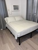Key property features include a queen bed, a comfortable chair, table, two dining chairs, a lamp, a well-appointed bathroom, complemented by a work computer nook for productivity and a fully-appointed kitchenette with cook top, full size microwave, full size refrigerator with water filter and ice maker, and sink and storage cabinets. The air conditioning ensures year-round comfort, while a ceiling fan adds an extra touch of convenience.