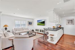 Inside, chic interior furnishings and a thoughtfully curated design create an atmosphere of modern coastal elegance. The open-concept layout features an updated kitchen, designated laundry room, and seamless flow between living and dining spaces. The spacious primary suite offers a serene retreat, complemented by a beautifully appointed bath with designer-grade finishes.