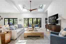 The open-concept living room, kitchen, and dining area boast breathtaking vaulted ceilings that soar to 12 feet, enhanced by an abundance of skylights and large windows, flooding the space with natural light. The main living area invites relaxation, featuring comfortable yet stylish furnishings and a state-of-the-art 65" 4K HDTV, perfect for movie nights or leisurely downtime. Gather around the grand eight-person dining table for memorable meals or entertaining, while the adjacent kitchen, complete with a four-seat counter bar, is ideal for culinary creativity.