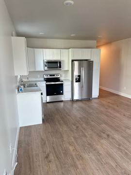 The apartment features high-end, non-scratch vinyl plank flooring throughout, oversized windows, and an in-unit full-size washer and dryer. The kitchen includes a refrigerator with ice/water dispenser, microwave, and dishwasher.