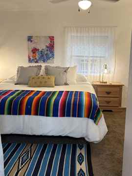 Stay in this Fully furnished Vacation home in Santa Fe, New Mexico, great for traveling businesspeople, families relocating, skilled workers, nomads and those pursuing academics. HOLIDAYS are around the corner!!! SPEND CHRISTMAS IN SANTA FE! ***STAY 3 DAYS $800, 7 DAYS $1800, OR THE ENTIRE MONTH FOR $3892.00 *** You will stay in one of the most sought-after historical neighborhoods, with all the amenities you need, luxury KING, QUEEN, two-bedroom, one full bath, short walk to Plaza, back door to the RAIL-YARD, close to everything, easy to plan your trip, plenty of parking, large yard space, A car is not necessary, as you are walking distance to everything. SLEEPS 4. ***CREDIT AND BACKGROUND REQUIRED*** House rules *Absolutely no smoking of any kind inside. *Absolutely no pets on beds or furniture, including sofa*Do not light candles or incense of any kind / fire hazard (the candles in the fireplace are there solely for show) thank you. *Please No cutting on butcher block counters- only use the cutting boards. *No Large Parties*No cats allowed. *Please steer clear of bamboo fencing in the backyard which protects historical structure. *Trash and recycle bins when full should be put out Tuesday evening, at the edge of the driveway for Wednesday morning pick up.... Thank you! *Property is listed for sale- guests must be willing to allow showings within a 24hr notice.