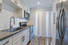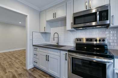 This modern studio boasts sleek grey hardwood flooring, elegant crown molding, and recessed lighting throughout. The kitchen is fully equipped with stainless steel appliances, including a stove, refrigerator, and microwave. Situated on the first floor of a charming 10-unit building, this apartment also features a private balcony for your enjoyment.