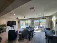 • Covered patio with patio furniture, fire pit, TV, fans, grill, pool with heater for off-season swimming