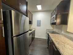 This unit comes complete with refrigerator, range, dishwasher, microwave and disposal. There is a washer and dryer in the bathroom for your convenience. There are air conditioners and ceiling fans for your comfort. The building has a swimming pool, and barbeque area. There is also guest parking in the building.