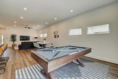 Fully furnished, move-in ready luxury home in Fountain Square! This 4-bed, 3-bath, 3,000 sq. ft. home blends modern design and comfort. The main-floor master suite features a king bed, en-suite bath with double vanities, glass shower, and walk-in closet. Upstairs are 3 bedrooms: 2 queens and 2 twins. The kitchen has stainless steel appliances, gas range, and island seating. Open-concept living room, pool table, and laundry room with Samsung units. Private fenced yard. Close to art, dining, and downtown!