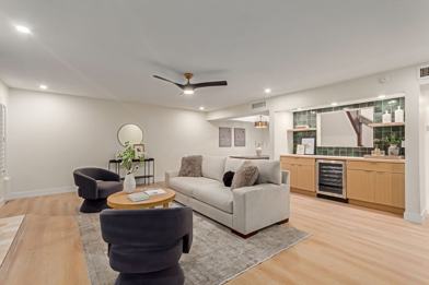 This home features a spacious open floor plan with upgraded tile flooring throughout, a modern kitchen with granite countertops and stainless-steel appliances, and 3 fully renovated bathrooms. The primary suite includes a private bathroom and walk-in closet. Amazing Loft w/ a chill bar! You'll love the natural light, vaulted ceilings, and cozy mid-century charm.