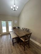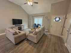 Step inside to a split, open-concept floor plan that seamlessly connects the living spaces. The living room features durable LVP flooring, a ceiling fan, and a vaulted ceiling, creating an inviting and spacious atmosphere. Adjacent to the living area, the kitchen shines with stainless steel appliances, granite countertops, a tile backsplash with under-cabinet lighting, and ample cabinet and countertop space. The kitchen is open to the dining and living areas, making it perfect for entertaining.