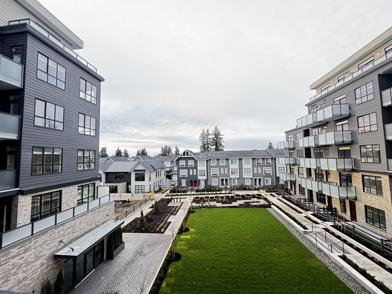 Brand new just completed building in the center of Fleetwood Village. South garden facing on third floor unit. Walkable to stores, banks, restaurants, parks. Convenient to public transit. One EV parking and locker included.
