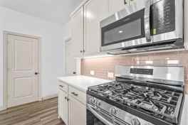 The spacious family room is perfect for relaxing or hosting, with large windows that bring in warmth and light. The gourmet kitchen is a standout feature, showcasing custom cabinets, quartz countertops, stainless steel appliances, and a designer backsplash with under-cabinet lighting for an elegant touch.