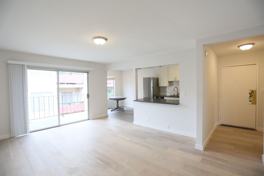 Bright, contemporary 1BR/1BA in Oakland's Adams Point neighborhood. Floors are hardwood except in bath. Huge living room provides access to the large, private deck. Concrete-floored deck has a nice area view. Galley-style kitchen is separated from the living room by a wall with an opening for two-person bar-style seating. Kitchen includes stainless gas stove and dishwasher. Bedroom has a wall closet with sliding mirror doors. Bath has shower-over-tub.