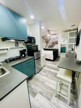 Stylish studio with a private entrance and designated parking spot. Modern kitchen Fully equipped with a fridge, cooktop, oven, microwave, toaster, waffle maker, espresso machine, and ice coffee maker.