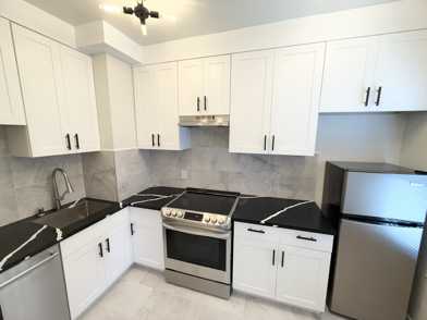 Modern design with brand-new appliances and a large, fully equipped kitchen with a family-size refrigerator and stove oven.