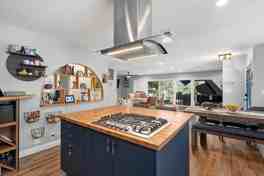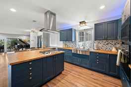 This custom-built home in La Mesa offers breathtaking panoramic views of Mt. Helix and sits on 3/4 acres, providing plenty of space and privacy. Inside, the kitchen is a standout with its navy blue cabinets, butcher block countertops, and a charming farm sink. Beautiful wood flooring, skylights, and large windows flood the home with natural light. The upgraded stainless steel appliances and renovated bathrooms add modern convenience. The home features central heat and air for comfort year-round.