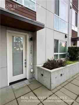 This bright and inviting townhome in a secured gated community is filled with natural light throughout. The main floor features an open-concept kitchen with stainless steel appliances, connecting to the spacious living room with large windows and a mini-split system for efficient heating and cooling. The lower level includes two cozy bedrooms and a well-appointed bathroom. Upstairs, the master suite offers natural light, a walk-in closet, and an ensuite bathroom with double sinks and a generous walk-in shower. Enjoy sweeping territorial views , including glimpses of Mount Rainier and downtown Seattle, from the rooftop deck Main bedroom and living room.