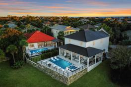 Nestled in the gated community of Destiny West, this 6 bedroom rental offers a blend of modern luxury and coastal charm. Situated on a cul-de-sac with parking for six, this stunning home lives up to its name with captivating sunset views via your private, heated pool on the lake. Inside, the turn-key coastal design exudes elegance with modern furnishings and open-concept kitchen boasting quartz countertops, a designer backsplash, double ovens, and a spacious island. The first floor includes two bedrooms with ensuite baths, providing convenience and privacy. Upstairs, you'll find four additional bedrooms, each with walk-in showers ensuring comfort for family and guests. Destiny West amenities include a community pool, tennis courts, fitness center, and private beach access.