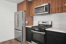KITCHEN : Modern Designer Cabinetry - White Stone Quartz Countertops - Designer Stainless-Steel Appliances - Refrigerator - Range w/ Oven - Microwave - Open Kitchen Space Layout