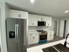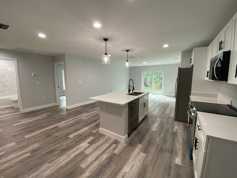 Step inside to an open-concept living area filled with natural light, featuring sleek luxury vinyl plank flooring, neutral tones, and contemporary finishes throughout. The spacious living and dining areas flow seamlessly into the stunning kitchen—complete with white shaker cabinets, stainless steel appliances, quartz countertops, and a large island perfect for cooking or entertaining.