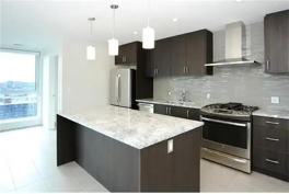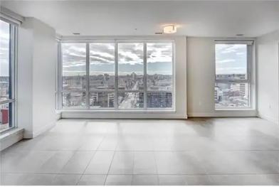 This upscale unit offers sweeping views through the floor-to-ceiling windows, an upgraded espresso kitchen with 42" cabinets, polished granite countertops, high quality steel appliances with gas stove and soft close drawers and doors. Two good-sized bedrooms both with full ensuites and heated floors and walk-in closets. Main floor den is perfect for working from home and has wall-to-wall tile floors