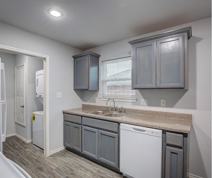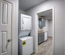 The kitchen includes refrigerator, electric range, microwave, dishwasher, and generous cabinet and counter space. A stacked washer and dryer unit is conveniently located within the home.