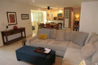 Upscale, immaculate one story, ground floor, garden retreat. Remodeled to perfection. Set alone to catch morning and afternoon sun. New kitchen, new baths, furnished perfectly with two sets of bay windows. Two patios with a few steps to the pool and spa all amongst mature gardens and a mountain view.