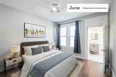 This Queen room in Columbia Heights offers flexible lease lengths, including a standard 12-month term and options up to 18 months. You pick your custom start and end date. Monthly rent rate is determined by furnishing preference, move-in date and move-out date. Speak to a June representative for recommendations on the best stay duration for the lowest rate.