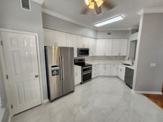 Step into this 2/2/1. This first-floor condo boasts 1403 sq. ft. of meticulously designed living space. As you enter, you'll be greeted by the timeless elegance of solid wood flooring, crown molding, fresh paint and high ceilings, welcoming you home! The kitchen has all new cabinets, counter-tops and NEW Stainless Steel Appliances, an eat-in area, and opens to the screened back porch with no rear neighbors, offering peaceful relaxation. Beginning and ending your day in your oversized master suite, complete with ensuite bathroom featuring double sinks, a large walk-in shower as well as a private water closet. The guest bedroom provides convenience and comfort, adjacent to the full guest bathroom and laundry room/utility closet in the hallway. Your new home also include a new water heater and newer a/c (3 years old).