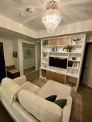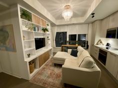 Bright, west-facing 1 bedroom + study with full windows & natural light, closet organizer systems and upgraded lighting. Furnishings are not included, however, built-in study, built-in living room shelving & entertainment unit (with storage cabinets/pet alcove on bottom) and custom roller shades and curtains.