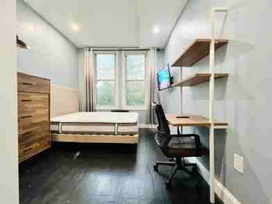 - Furniture included: bed, mattress, closet, nightstand, curtains/shades, desk, chair, sofa, kitchen table.