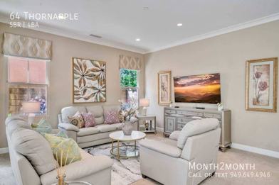 64 Thornapple, Irvine, CA is a 5 bedroom, 4 bathrooms apartment for rent. It is located in the Irvine Spectrum neighborhood of Irvine. It has apartment amenities including walk-in closets, central heat, dishwasher, air conditioning, in-unit laundry, assigned parking, outdoor space, balcony, furnished, and microwave. Cats and dogs are allowed, making it a pet-friendly apartment.