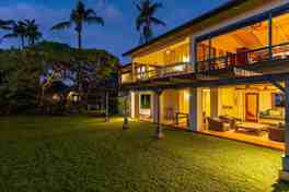 After a day of surfing at Laniakea, snorkeling in the summer months, or whale watching from November to April, retreat to the breezy, well-appointed bedrooms, each designed for comfort and relaxation. The primary suite offers a king bed, en-suite bathroom, and breathtaking ocean views, creating a serene escape. The second bedroom features a king bed and a private bath, while the third bedroom includes a queen bed with tranquil island views. The fourth bedroom is ideal for families or extra guests, with a king bed plus a trundle, ensuring ample space for everyone to unwind. Wake up to the sound of the waves, let in the ocean breeze, and enjoy the peaceful ambiance that makes this beachfront retreat truly special.