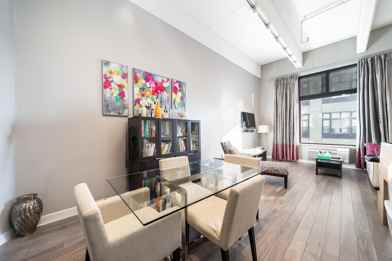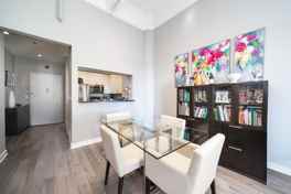 Welcome to this spacious, sun-drenched studio loft with soaring 14' ceilings and dramatic 10' picture windows offering a stunning Southern exposure. This thoughtfully designed space features a sleeping alcove, beautiful custom-built wall unit with a work space and added storage outfitted with specialty organizers and has been fully upgraded with new high-end wood flooring throughout. Custom room-darkening shades and blackout curtains ensure privacy and comfort at any time of day. The open-concept kitchen boasts a beautiful mosaic glass tile backsplash, upgraded cabinets with sleek matte black hardware, and high-end stainless steel appliances. The layout flows seamlessly into dedicated dining and living areas, perfect for both relaxation and entertaining. The bathroom, finished with classic black and white tiles, offers plenty of space for additional storage and the convenience of in-unit laundry. Premium parking spot is included! Statuesquely situated along the edge of Hudson River overlooking New York City, The Hudson Tea Buildings is an iconic, meticulously maintained community that offers unmatched access to all forms of transportation, the Hudson River Waterfront Walkway, and everything that makes Hoboken and New York City so special. In addition to a 24-hour concierge and a dedicated, skilled service staff, the Hudson Tea offers a full suite of luxe amenities including a nearly 3000 sqft gym with Pelotons and included fitness classes, stunning resident's lounge with private dining room w/NYC views, a new free WFH space, new kid's playroom, 3 high-speed elevators, free shuttle to/from PATH, dry cleaner, Choc O Pain French cafe onsite, and resident's courtyard with fire pit perfect for alfresco dining. Additional amenities include bike & add'l on site resident's storage. Located within proximity to neighboring Harborside & Maxwell Parks, boutique shopping, outdoor eateries, Soul Cycle, Pilates, spas, wine shops, and easy access to transportation including the Direct 14th St Ferry to Midtown & WFC. With Trader Joe's, Whole Foods, farmer's market, and Urban Market groceries, every convenience is at your doorstep.