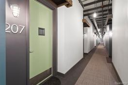 Discover urban living at its finest in this stunning modern loft-style condo, perfectly situated in the heart of Downtown Ferndale. This stylish residence features a secured entrance to the Building, 1 bedroom and 1 bathroom, boasting high ceilings, exposed brick, and sleek ductwork that amplify its contemporary charm. The polished concrete flooring throughout adds an industrial touch, seamlessly blending with the open-concept design. The expansive Living Room includes the leather sofa and is bathed in natural light, thanks to floor-to-ceiling windows and a doorwall leading to a spacious South-facing balcony, prime front of the Building. Enjoy breathtaking views of Woodward Avenue and the vibrant Downtown area, all from the comfort of your unit. The Kitchen is a chef's delight, featuring modern white cabinetry, luxurious marble countertops, and stainless steel appliances. The generous Bedroom offers a tranquil retreat, complete with a large custom closet organizer, while the in-unit Laundry adds everyday convenience. The luxurious Bathroom features a vessel sink, floating vanity, custom tile & a tub/shower combination. An attached secured parking garage provides one assigned parking space, and with walking distrance to bars, restaurants, shopping, I-696, I-75 expressways, commuting is effortless. Ready for immediate occupancy, this impressive condo offers an unparalleled lifestyle in Downtown Ferndale. Don’t miss your chance to live in the center of it all! Available November 1st 2025.