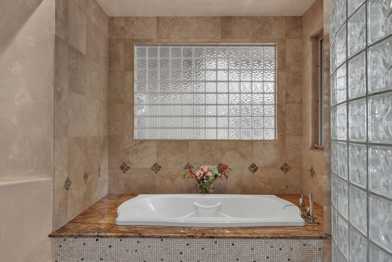 - Walk-in shower with glass enclosure and dual showerheads