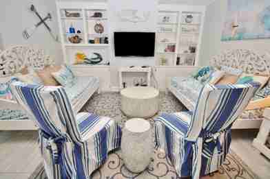 Follow the wood-grain tile that leads you into the home's main living area. Those with an eye for design will be smitten with the living room's shabby-chic décor and beautiful built-in console. This area not only seats six but also sleeps two as the couches are daybeds. Once you've picked a cozy spot, you can enjoy shows & movies on the flat-screen TV equipped with cable and streaming services. Just make sure to bring your own log-ins!
