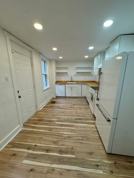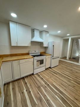 The bright and airy kitchen is a showstopper, featuring brand-new white cabinetry, butcher block countertops, subway tile backsplash, and sleek new appliances. Recessed lighting and open shelving add a contemporary touch, making this space as stylish as it is functional.