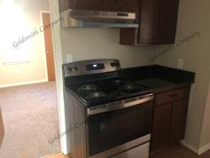 countertops, stainless steel refrigerator and stove. Bedroom has