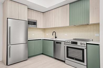 *Our one-bedroom apartments* embody modern elegance with touches of eco-conscious luxury. From the sleek kitchen designs featuring oak wood finish cabinetry to the serene baths adorned with Japanese penny tiling, each space reflects a commitment to both style and sustainability. With private balconies seamlessly blending indoor and outdoor living, these apartments offer a sanctuary in the heart of the city.