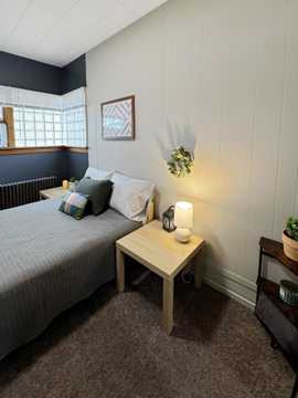Fully furnished end-unit and Newly Renovated 1 bedroom apartment for 1-2 people. We are located downtown Hallock, Minnesota. Conveniently located a block from the coffee shop, wine bar, boutique, local gym, brewery, library, grocery store, gas station, post office, dollar store, and more. It includes a bedroom (open layout) with double bed, large closet, small bathroom with shower, full kitchen, and a dining/living room with couch/TV/table. Coin-op laundry is in the building. All furnishing/utilities/fiber optic wifi/basic essentials is included in rent. More affordable than a hotel with the privacy/vibe of a residential building with quiet hours. No pets, smoking, or parties. 1-2 off street parking spots.