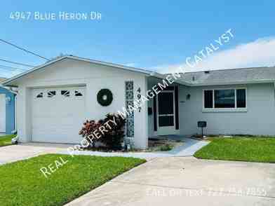 Rent Reduced! Complete remodel. Welcome to the beautifully remodeled 2 bed 2 bath waterfront canal home in Flor-A-Mar, New Port Richey, FL. This stunning property boasts a range of high-end features, including granite countertops and brand-new stainless steel appliances. The home has been completely remodeled, offering a fresh, modern living space. The new HVAC and hot water heater ensure comfort and efficiency. The property also includes a one-car garage and a double driveway for ample parking. The screened lanai patio provides a perfect spot to enjoy the waterfront canal views. As an added convenience, a stackable washer/dryer is provided, and lawn service is included. The home is located in a community with a private beach club, Gulf Harbors South Beach, offering a unique blend of comfort, luxury, and outdoor enjoyment. The membership to the Gulf Harbors Private Beach Club is also included through March 2026. This is waterfront living at its finest.
