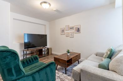 This spacious and stylish 2-bedroom, 1-bath basement apartment offers 900 sq ft of comfortable living with a private entrance and exclusive use of the entire basement. Featuring a cozy living room, fully equipped kitchen, and in-unit washer and dryer, it’s designed for both relaxation and convenience. The first bedroom includes a queen bed, desk with monitor, and dresser, while the second has a full bed. Guests can also enjoy a private patio, and a fenced backyard with a fire pit—ideal for unwinding outdoors in a peaceful setting.