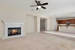 Spacious family room with a cozy fireplace and recessed lighting