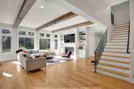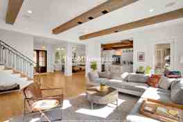 Step into a sun-soaked sanctuary where elevated design meets everyday comfort. The main living area is framed by soaring ceilings, crisp white walls, and rich wood beams that add warmth and character. A wall of oversized windows bathes the space in natural light while offering peaceful views of the lush backyard, making this the ultimate spot to unwind or entertain. A modern fireplace anchors the built-in shelving, perfect for displaying books, art, or treasured keepsakes. Adjacent to the living room, the formal dining area shines with statement lighting and double-height windows that create a magazine-worthy ambiance for hosting dinner parties or holiday gatherings.