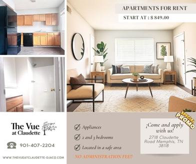 At The Vue at Claudette there is a perfect home waiting for you. We offer spacious one, two and three bedroom apartments with walk-in closets, ceiling fans, washer/dryer hook ups, window coverings, intrusion alarms and upgraded countertops. Our pet friendly and family friendly community also offers a playground and a laundry center. The Vue at Claudette's exceptional location offers the convenience you have been searching for. Located off of American Way, we are just minutes from restaurants, shopping and entertainment. You'll have easy access to I-240 and public transportation.