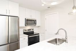 The 880 sqft apartment offers comfortable, modern living with luxury vinyl plank flooring throughout. The open living room and dining area flow into a galley-style kitchen featuring quartz countertops and stainless steel appliances. The space includes a full bath with tile flooring, a spacious bedroom with a walk-in closet, and a stacked front-load washer and dryer for added convenience.