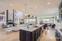 Inside, the gourmet kitchen is a true centerpiece, featuring sleek marble countertops, a spacious kitchen island with an integrated sink, and high-end appliances including a refrigerator, stacked oven, and microwave. The large family room and living room with soaring ceilings create a bright, welcoming atmosphere, enhanced by oversized windows that flood the home with natural light.