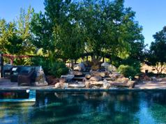 Attached cherub house has 2 bed 2 bath full kitchen and living room that overlooks koi pond and waterfalls.