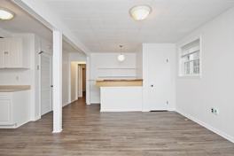 The 964 sqft apartment includes a private side entrance, LVP flooring throughout, an open living room with a built-in bar area, a kitchen with white cabinets and appliances, a bedroom, a home office/guest bedroom, and a full bath. Washer and dryer are included. On-street parking is available.