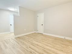 The apartment features a bright and spacious living room with fresh paint, luxury vinyl plank flooring, and modern black fixtures throughout. The bathroom includes a new tub, vanity, and toilet, creating a warm and modern feel. The bedroom is comfortably sized and filled with natural light.