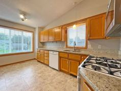 The vaulted gourmet kitchen boasts expansive granite countertops and upgraded cabinets, with ample space for a breakfast table. A formal dining room opens to a large deck, perfect for entertaining. The spacious living room overlooks the grand entry and the private backyard with fencing.